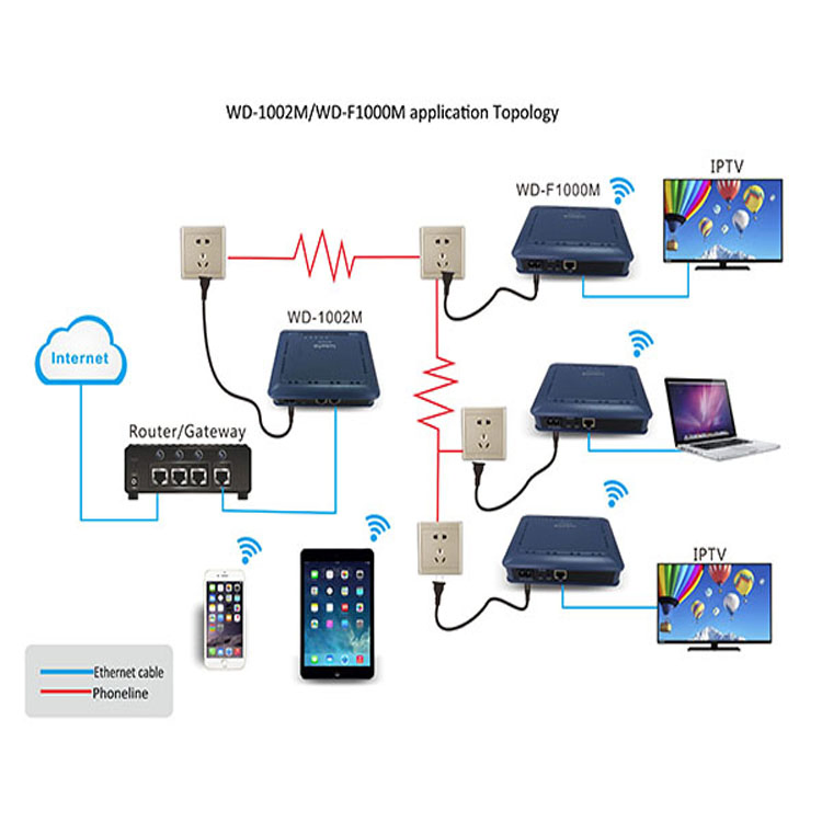 Consumers today face a mix of Non-inter -operable home networking technologies. G.hn offers a single wired international standard for connecting devices. Every power outlet in home becomes a network connectivity point on the same mesh network, brings convenience and flexibility to consumers. This enables datum to be delivered seamlessly from one medium to another.WD-1002M is an Ethernet wall mountable bridges which can guarantee the reliable performance and good user experience on every power outlet in the home. With WD-1002M /WD-F1000M multimedia distribution is available even in the environment with thick walls and multiple floors. In addition to the function of transferring HD digital signals, the WD-1002M also can transmit remote commands over the house existing power lines, so users can operate remotely in the TV viewing room to get the AV source located in another room. The WD-1002M will allow consumers easily connect various HD sources to HD TVs or projectors throughout the home without having to install any new wiring or be pestered by complicated set-ups. With the existing electrical lines which providing a fast, reliable wired connection between various entertainment components, consumers can enjoy the entertainment grade video at any virtual power outlet.