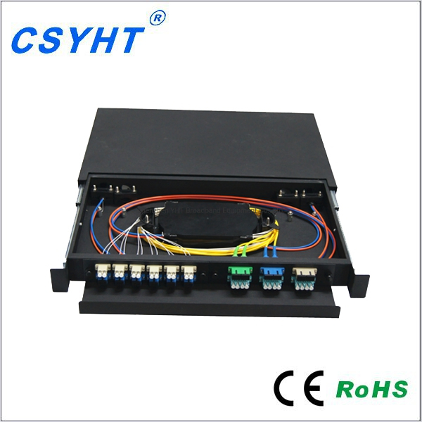 Features:Standard size, light weight and reasonable structureSlide out drawer for easy cable managementFC, SC, ST, LC ... adapter patch panel for option, easy to replaceFront access panel design for easy operation Suitable for 19'' standard optic distribution cabinetsMax. capacity 24 fibers, two splice trays of 12 fibers 4 fiber cable entry ports at rear sideWhite or black colorMaterial: Cold-roll steelSpecification:Model | Capacity | Height | Dimension(mm) | Weight(Kg) |