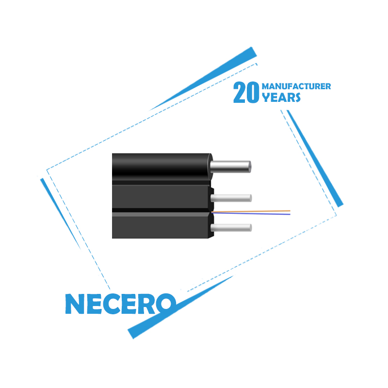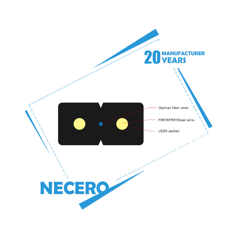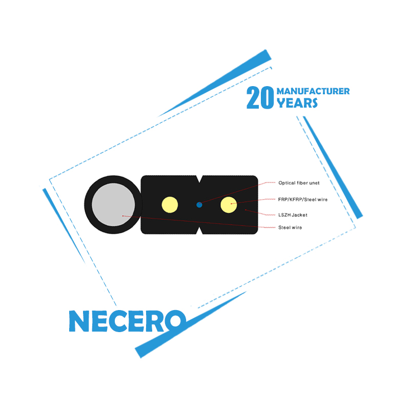 The optical fiber unit is positioned in the centre. Two parallel Fiber Reinforced Plastics (FRP) are placed at the two sides. A steel wire as the additional strength member is also applied. Then the cable is completed with a black LSZH sheath.