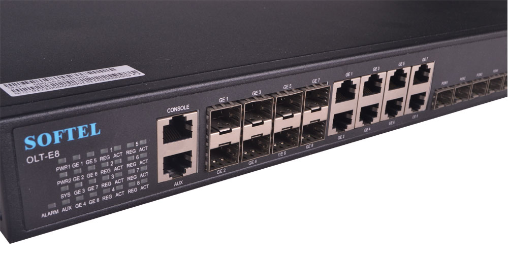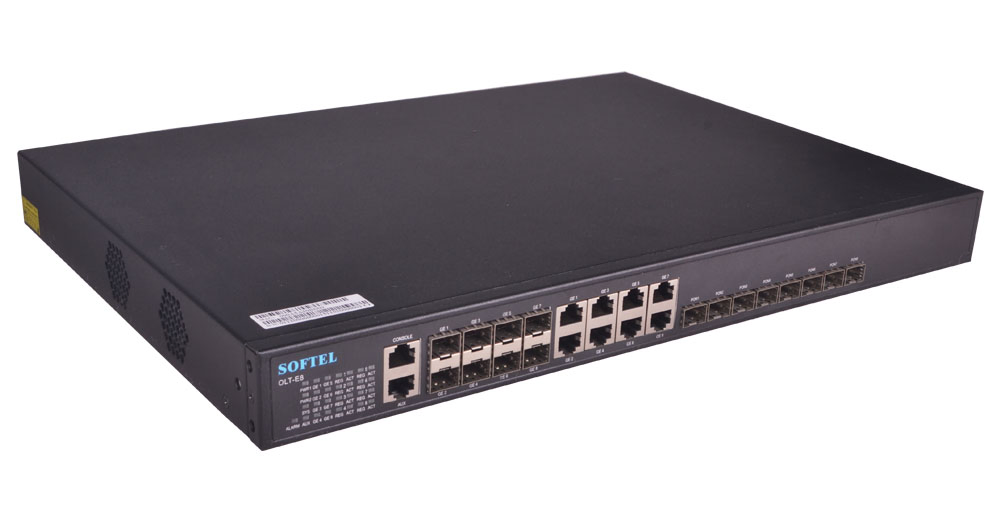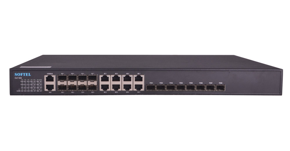 8PON Ports 1U Pizza-Box OLT provides 8GE(copper) and 8SFP slots Combo interface for uplink, and 8 EPON ports for downstream. It can support 256 ONU under 1:64 splitter ratio