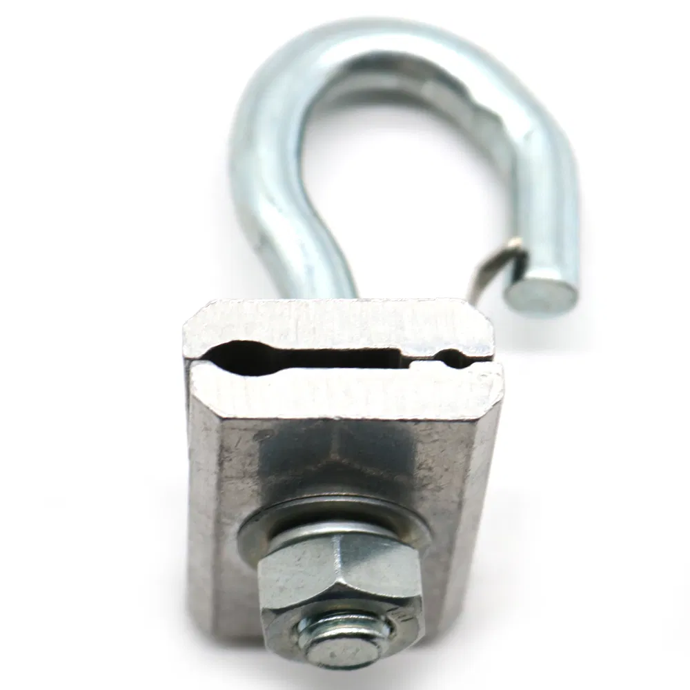 FTTH Two slots hookDetails Images: MaterialHook:Galvanized SteelPlate:Aluminum Alloyweight123gApplication:Two slots hook is fastened on galvanized steel wire,to connect and fix S type anchor clamp onto galvanized steel wire.