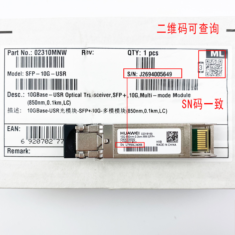 SFP-10G-USR Huawei 10GE SFP+ Optical Modules 02310MNWTechnical specificationsItemDescriptionTransceiver form factorSFP+Transmission speed10GECenter wavelength (nm)850Standards compliance10GBASE-USR (non-standard)Connector typeLCApplicable cable and maximum transmission distanceMultimode fiber (OM3):......