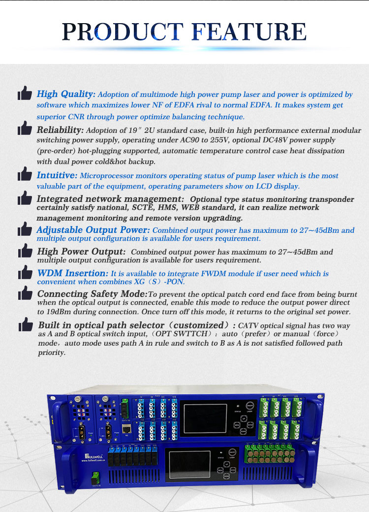 1. Top quality: Adopt JDSU multi-mode high-power pump laser and the power is optimized through software, which makes the system achieving excellent CNR AND minimizing the NF of EDFA.