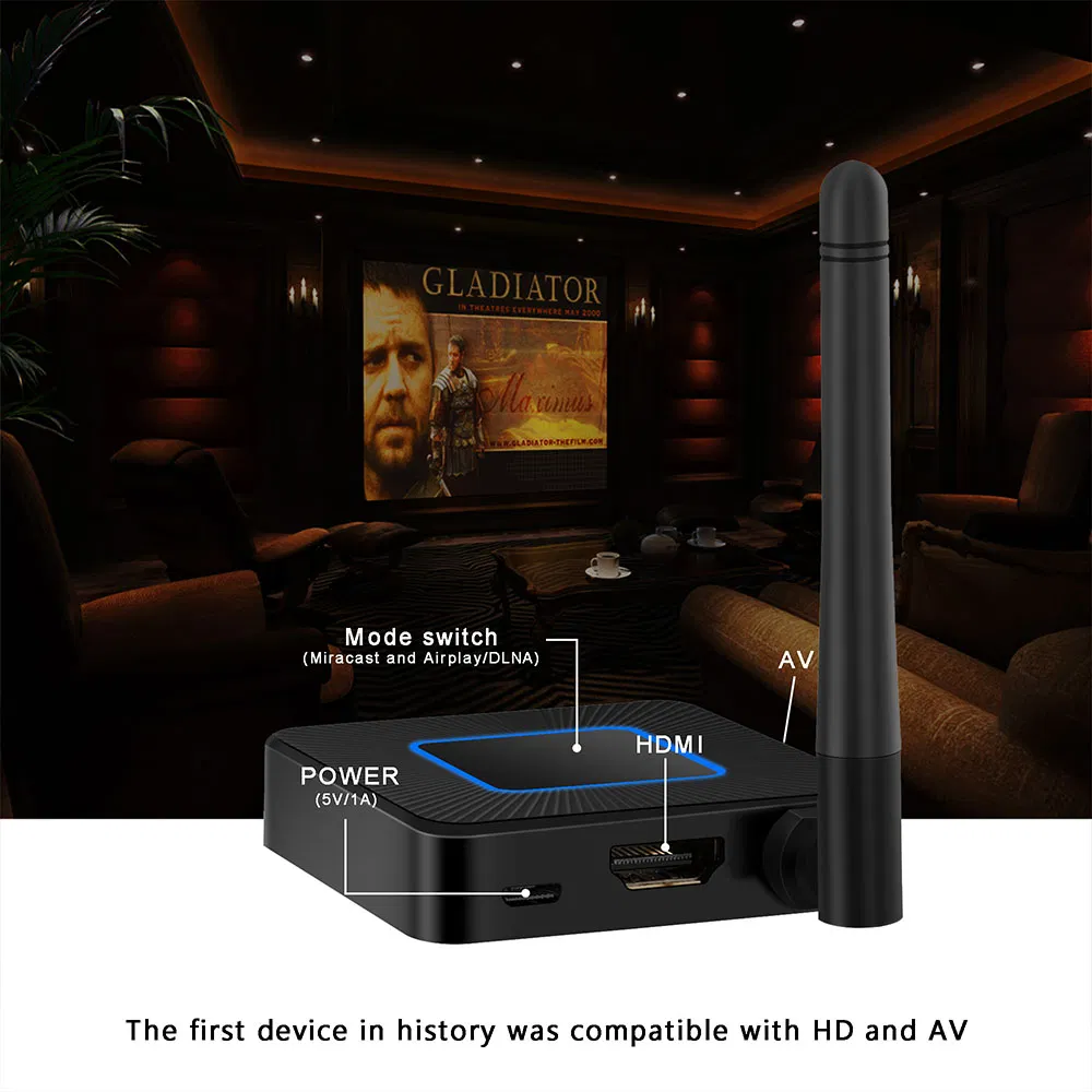 Full HD wireless screen mirroring 2.4GHz/5GHz wifi audio and video transmission display miracast airplay dongle Product Description Product ParametersQ4 Mirroring Dongle Product specificationSpecification parametersSize58mm(L)x58mm(W)x15.2mm(H)Weight170g Color BlackInterface1) HDMI 1.4a Int......